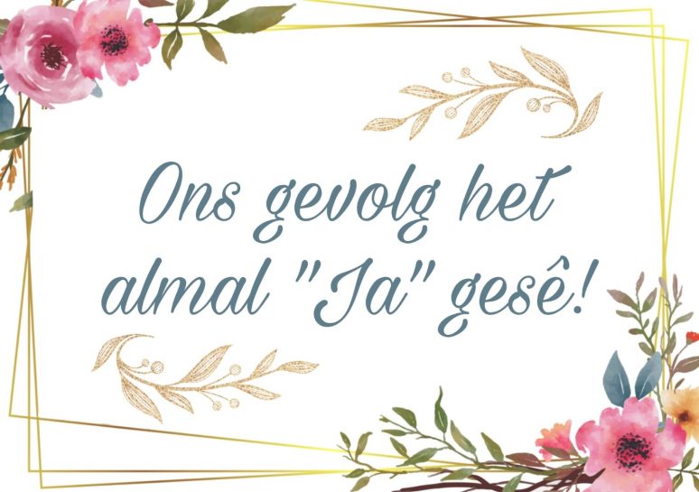 Om Jou Teenwoordigheid Te Bevestig Moet Jy ‘N Deposit Betaal Van R 400 Per Persoon. Die R 400 Sal Jy Terug Ontvang Wanneer Jy Opdaag Vir Die Troue. Indien Jy Nie Opdaag Nie, Gaan Die R 400 Gebruik Word Om 50% Van Jou Kostes Te Dek.
